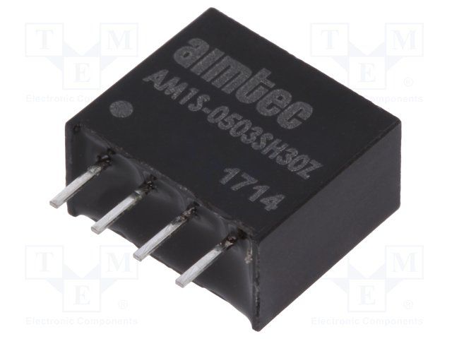 DC/DC Converter; Product Weight (grams): 1.5; Input voltage min (V): 4.5; Input voltage max (V): 5.5; Output voltage min: 3.3; Output voltage max: 3.3; Output voltage dual assymetric (y/n): Single; Output Power (W): 1; Max Output current (A): 0.303; Efficiency (%): 78; Max Capacitive load (µF): 220; Package type: SIP4; Mounting: PCB; W (in): 0.24; L (in): 0.46; H (in): 0.4; W (mm): 6; L (mm): 11.68; H (mm): 9.7; Min Operating temperature: -40; Max operating temperature (°C): 85; Isolation (VDC): 3000; EMC compliance 2: EN 55032 Class B; Case material: Plastic (flammability to UL 94V-0) ; Application 4 (building automation/IoT): 1; MTBF (h): 1121000; Derating : 85; Voltage Accuracy (%): ±3; Line Regulation (% of Vin): ±1.2% per 1% Vin Change; Load Regulation %: ±20; Ripple & Noise (mV p-p): 100; Switching Frequency typ (KHz): Variable 80; Short circuit protection: Momentary